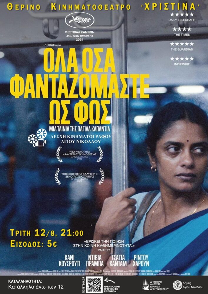 Με την βραβευμένη στις Κάνες ταινία “Όλα Όσα Φανταζόμαστε ως Φως – All We Imagine as Light” συνεχίζονται οι εβδομαδιαίες προβολές επιλεγμένων ταινιών, που διοργανώνει κάθε καλοκαίρι η “Λέσχη Κινηματογράφου Αγίου Νικολάου”, σε συνεργασία με την Δημοτική Ανώνυμη Εταιρεία Αγίου Νικολάου (Δ.Α.Ε.Α.Ν).