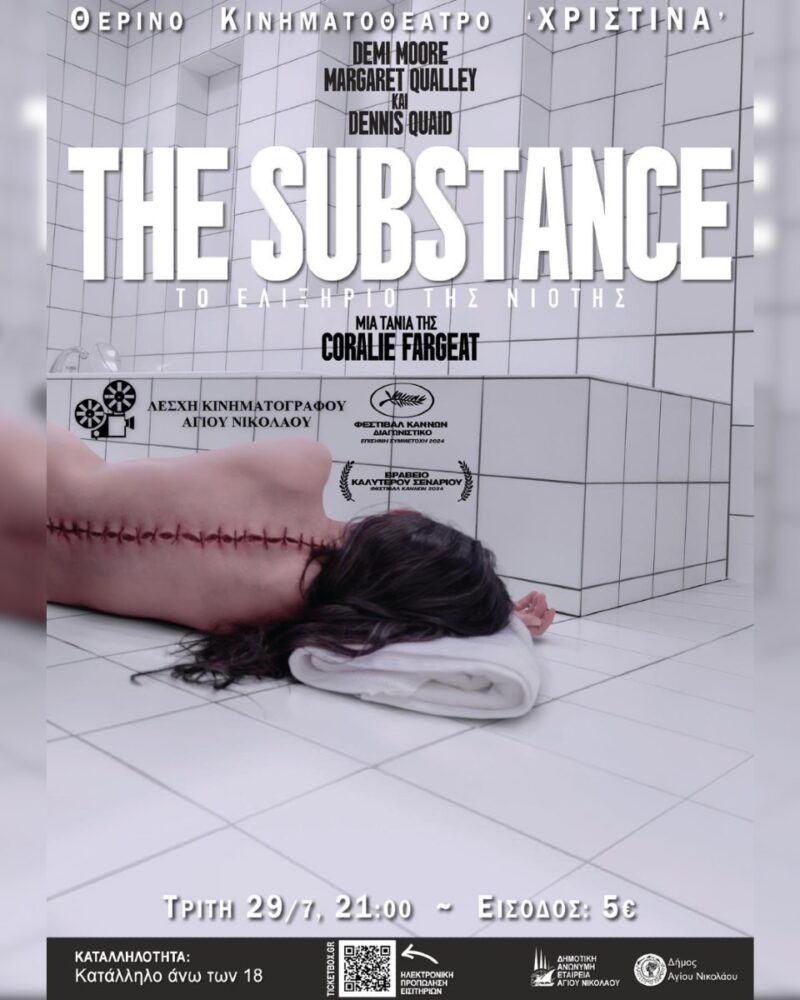 Με την βραβευμένη στις Κάνες ταινία “The Substance: Το Ελιξίριο της Νιότης” συνεχίζονται οι εβδομαδιαίες προβολές επιλεγμένων ταινιών, που διοργανώνει κάθε καλοκαίρι η “Λέσχη Κινηματογράφου Αγίου Νικολάου”, σε συνεργασία με την Δημοτική Ανώνυμη Εταιρεία Αγίου Νικολάου (Δ.Α.Ε.Α.Ν).