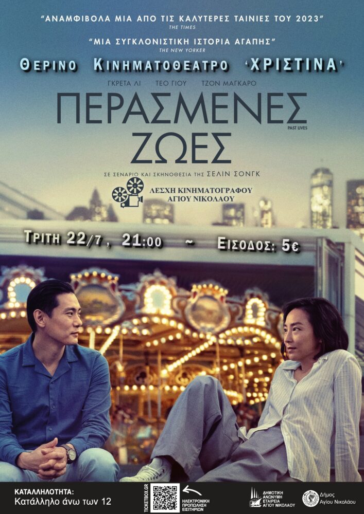 Την Τρίτη 22 Ιουλίου 2025 στις 21:00, στον θερινό δημοτικό κινηματογράφο “Χριστίνα”, θα προβληθεί η τελευταία δημιουργία της Σελίν Σονγκ “Περασμένες Ζωές – Past Lives”. Το ντεμπούτο της Νοτιοκορεάτισας δημιουργού είναι ένα μοντέρνο ρομαντικό παραμύθι, που αριστοτεχνικά αποφεύγει όλα τα αναμενόμενα κλισέ και συγκέντρωσε τις καλύτερες κριτικές της χρονιάς παγκοσμίως. Είναι μια συγκινητική ελεγεία για την αγάπη και το ρόλο της τύχης και των πιθανοτήτων στις ανθρώπινες ζωές και ήδη θεωρείται κλασικό στο είδος του. Με 87 βραβεύσεις ανά τον κόσμο και υποψηφιότητα για ΄Οσκαρ Καλύτερης Ταινίας και Σεναρίου, είναι παραγωγής Η.Π.Α 2023, διάρκειας 105΄ και πρωταγωνιστούν οι: Γκρέτα Λι, Τέο Γιό, Τζον Μαγκάρο.